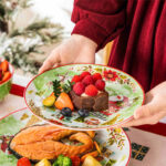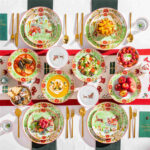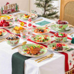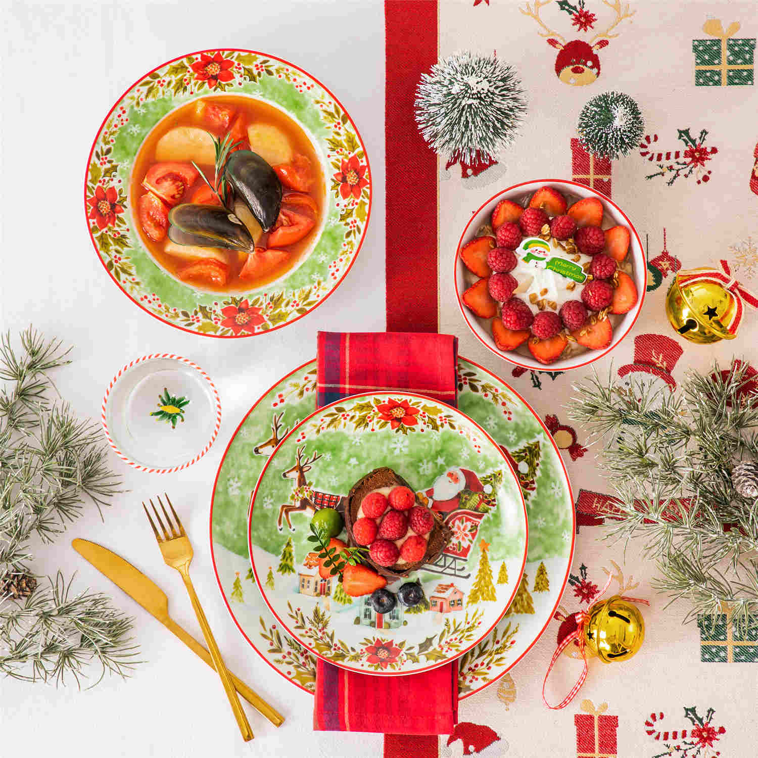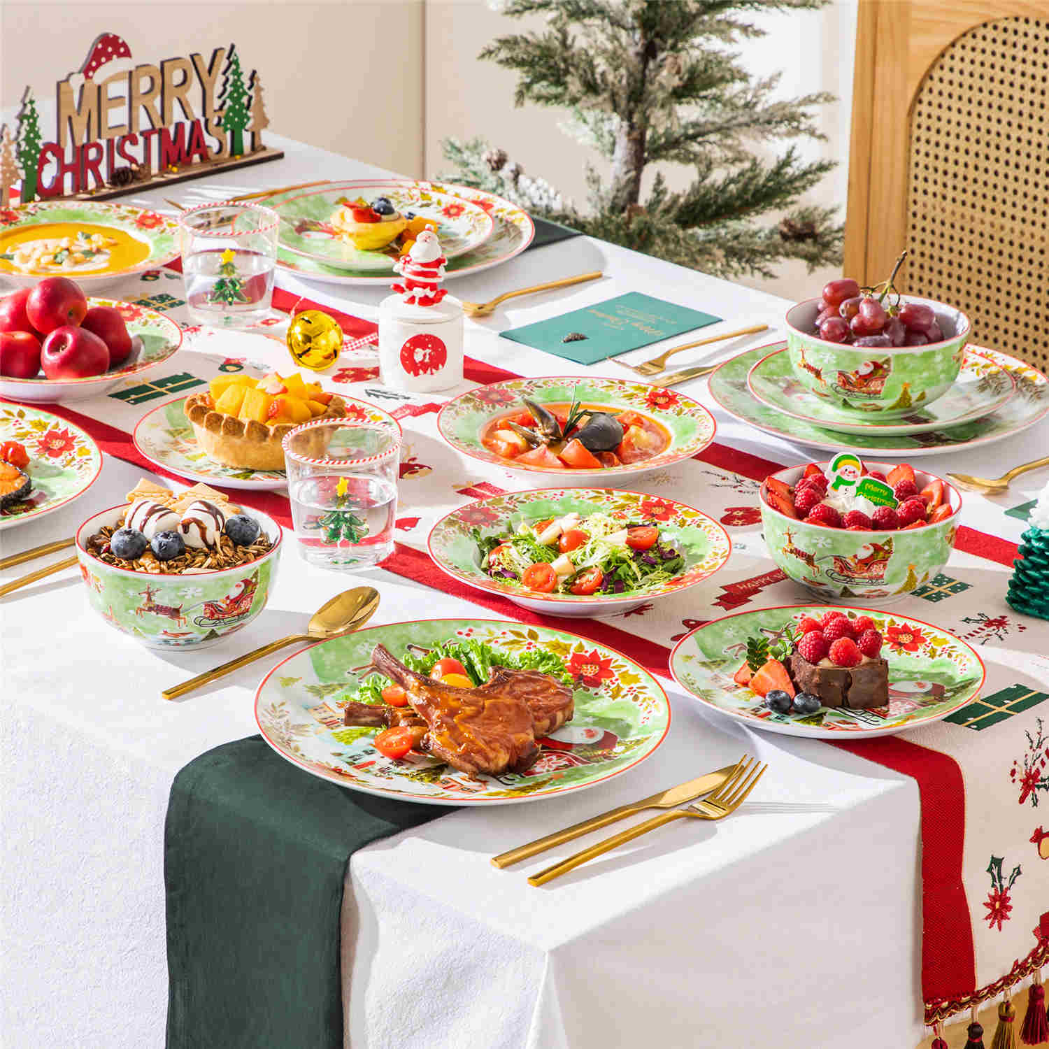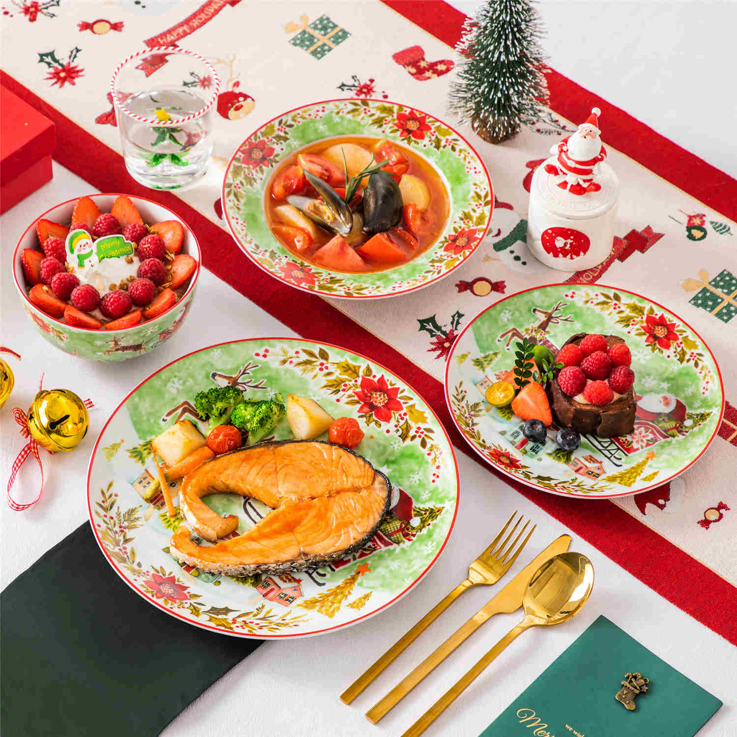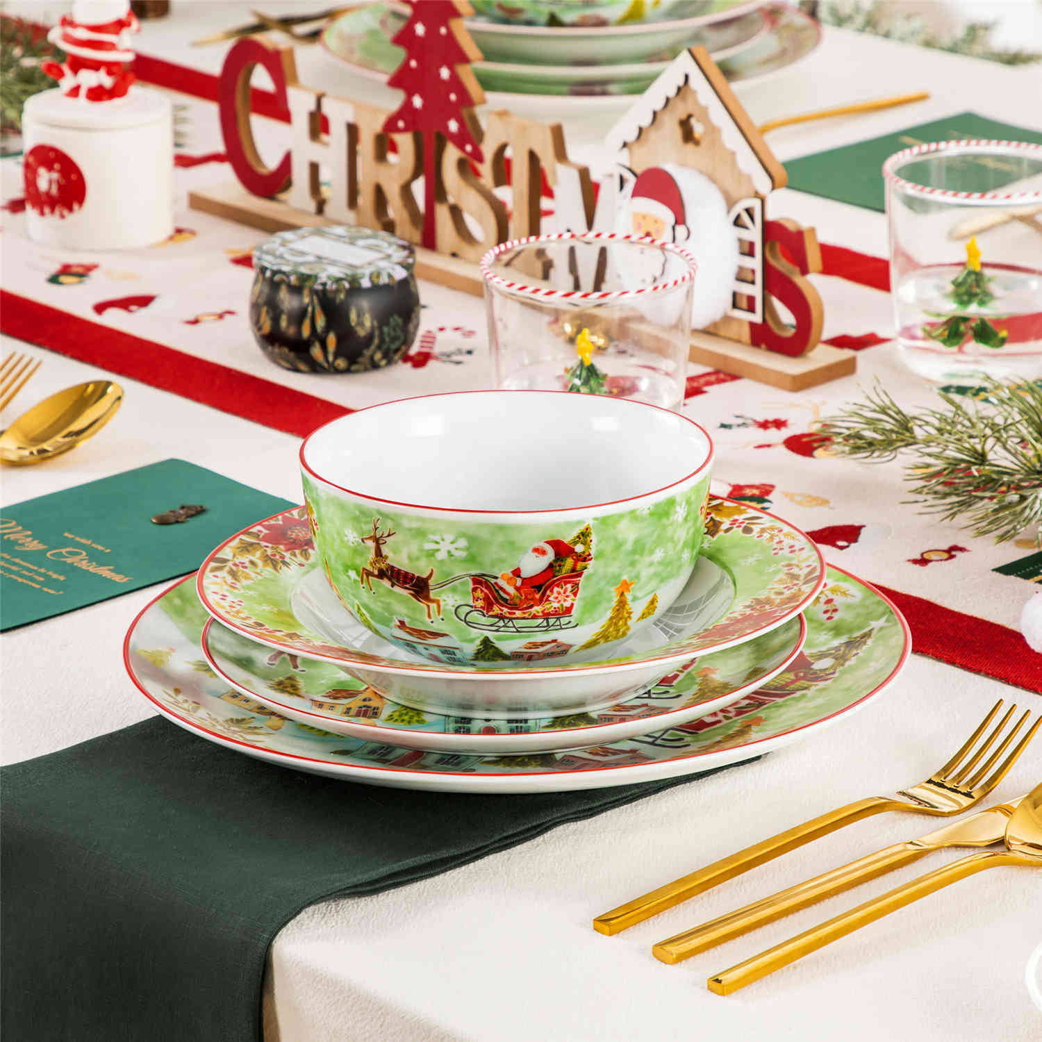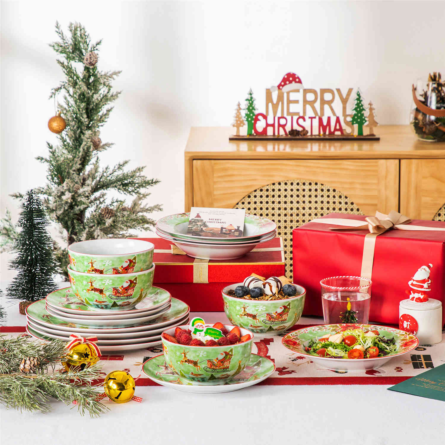 Celebrate the season with this 16-piece porcelain dinnerware set, featuring Santa, reindeer, and vibrant poinsettias. The set includes dinner plates, salad plates, soup plates, and cereal bowls for four. Stackable and non-toxic, it’s microwave, dishwasher, and oven safe, perfect for holiday meals and family gatherings. Bring festive charm to your table and create lasting holiday memories!