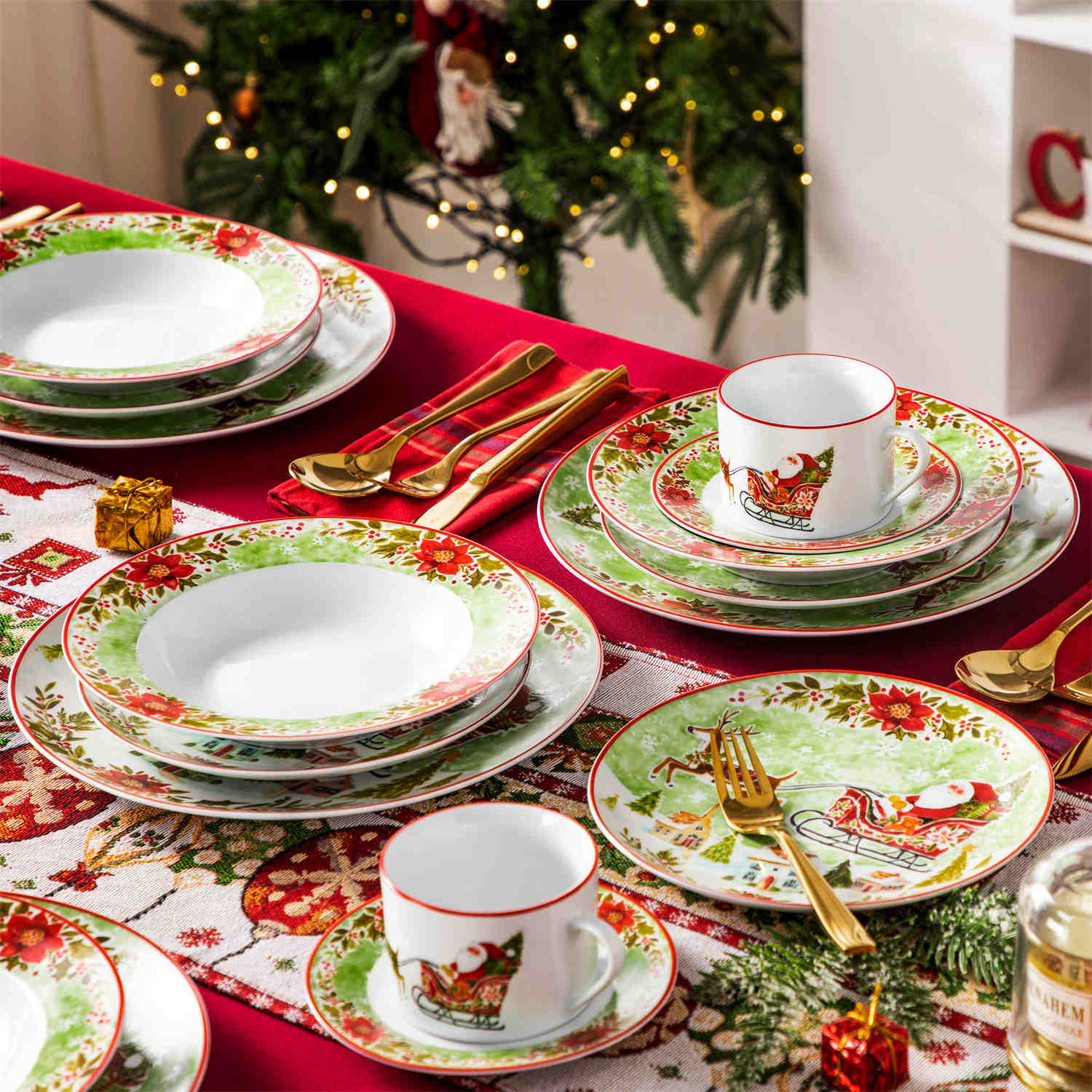 Celebrate the season with this 30-piece porcelain dinnerware set, featuring Santa’s sleigh, reindeer, and vibrant poinsettias. The set includes dinner plates, salad plates, soup bowls, and cups with saucers for six. Stackable and space-saving, it’s microwave, dishwasher, and oven safe—perfect for holiday gatherings and festive meals. Add a touch of Christmas charm to your table and create lasting memories with this delightful set.