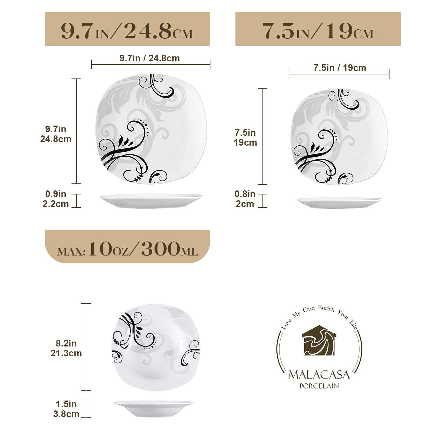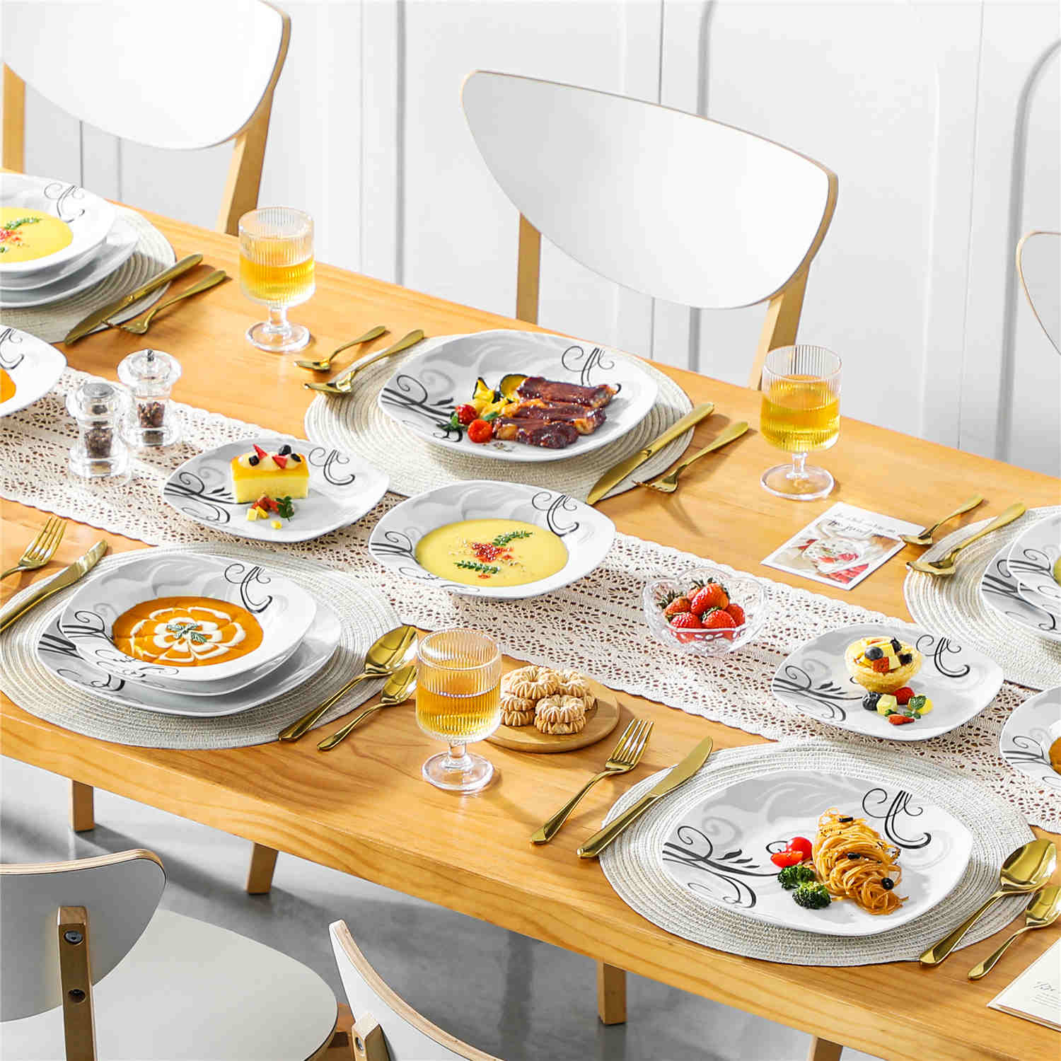 • Fine porcelain square dinnerware set, service for 6, black decal pattern