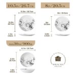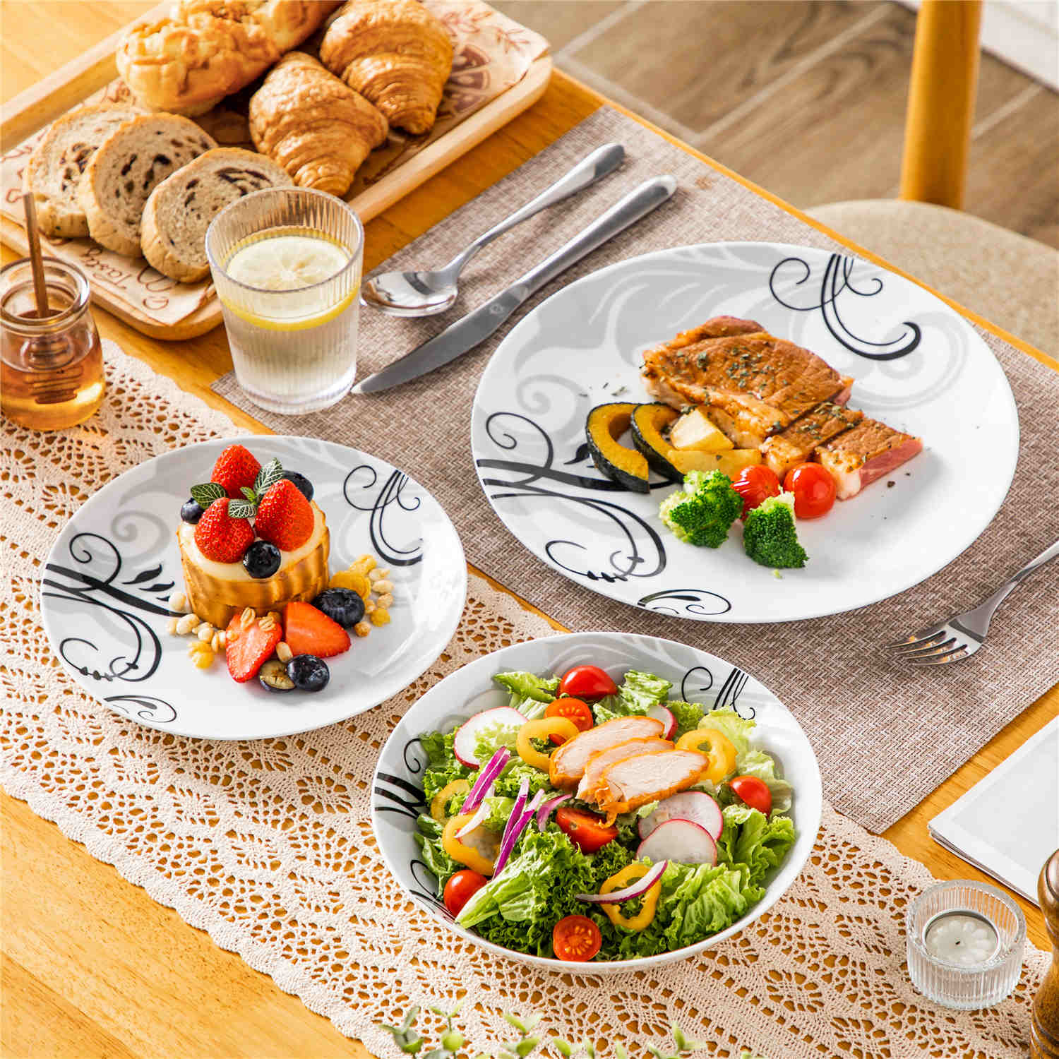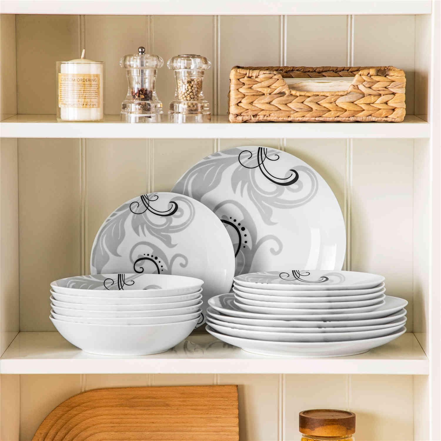 The Zoey 18-Piece Round Dinnerware Set combines elegance with practicality. Made from premium porcelain, it includes 6 dinner plates, 6 salad plates, and 6 soup plates, featuring black and silvery floral patterns on a glossy off-white glaze. Stackable for easy storage, it’s microwave, oven, and dishwasher safe, with a non-porous surface for effortless cleaning. Perfect for everyday meals or special occasions.